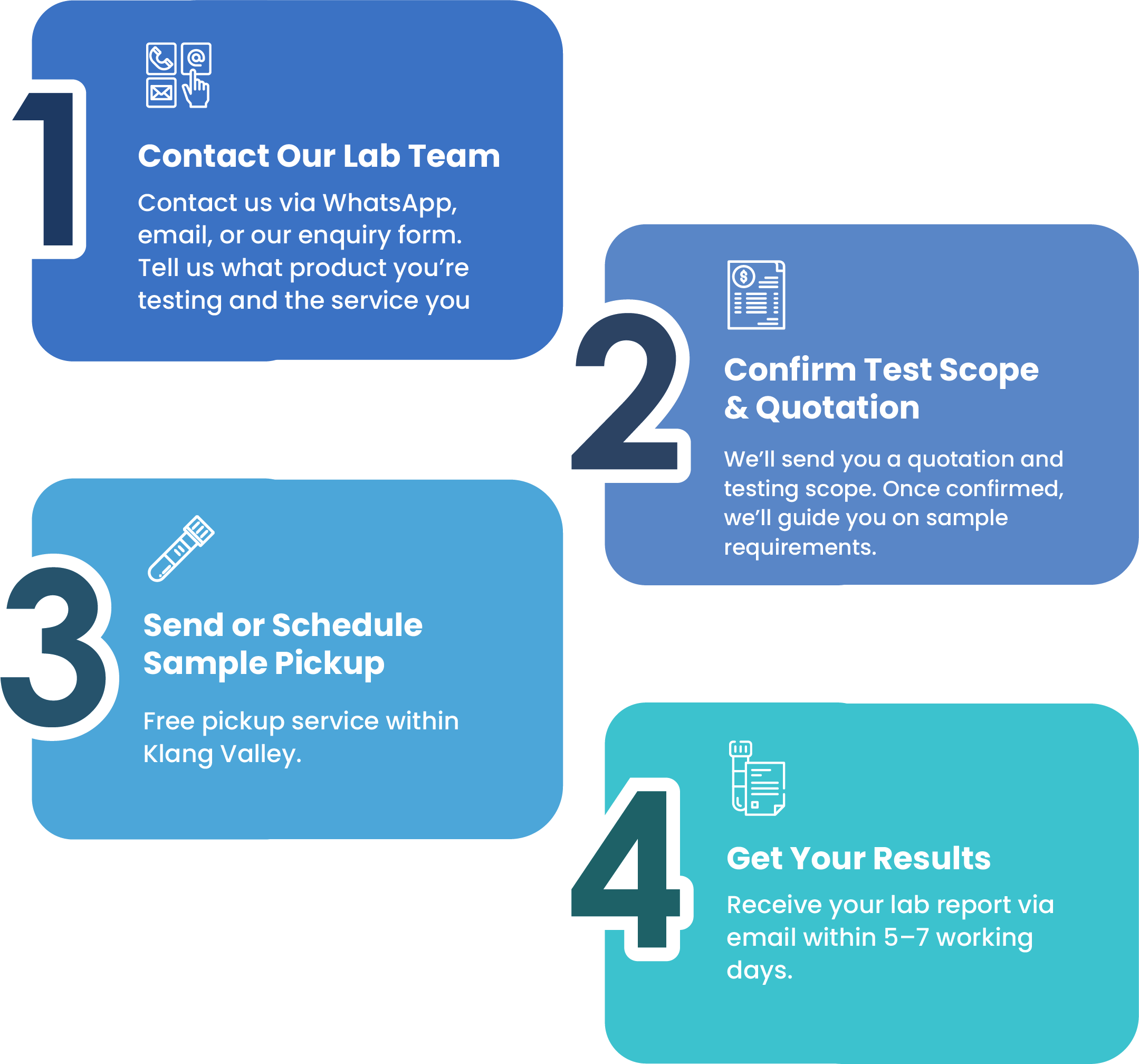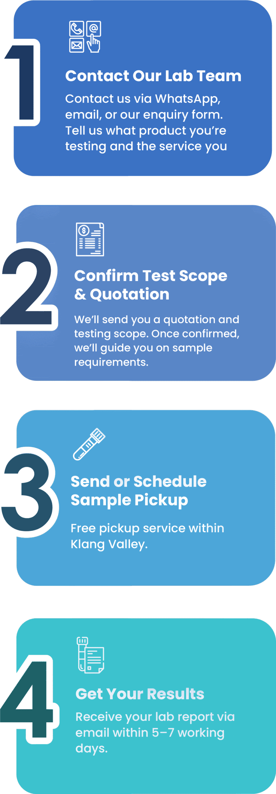 We offer free on-site or off-site sample collection within the Klang Valley. For locations outside the Klang Valley, kindly contact our office for further arrangements and assistance.